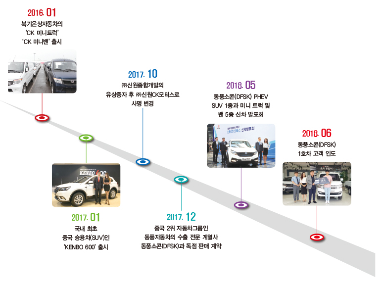 신원CK모터스는 이를 바탕으로 동풍소콘의 미니 트럭과 미니밴 5종을 추가로 도입, 국내 중국산 자동차 수입업체 중 최다 라인업을 구성했다.
