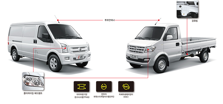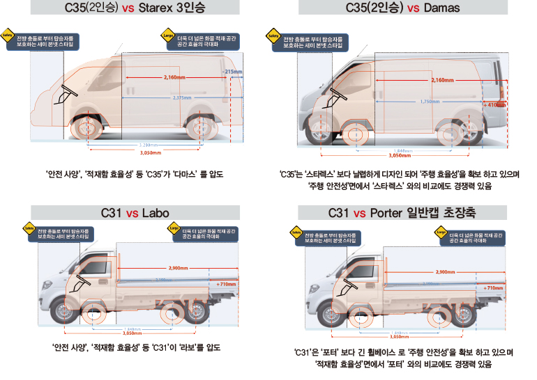 나아가 듀얼에어백까지 기본사양으로 장착해 기존 국내 경상용차에 비교할 수 없는 수준의 안전성을 갖췄다.