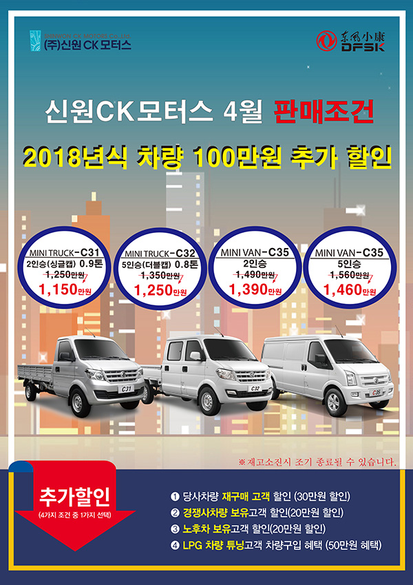 DFSK의 0.7~0.9톤 소형 트럭과 2인승/5인승 밴을 전문적으로 판매하고 있는 신원CK모터스(대표이사 이강수)가 4월을 맞이하여 ‘봄맞이 특별 할인 행사’를 진행한다고1일 밝혔다.