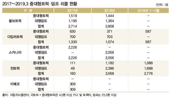 볼보트럭과 스카니아는 전년도와 비슷한 흐름을 보였다. 볼보트럭이 두 차례, 스카니아가 한 차례 리콜을 단행했다. 올해는 3월까지 이뤄진 리콜이 없다.