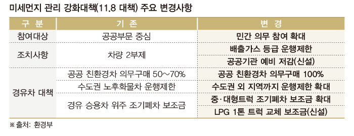 실현 여부를 떠나, 정책도 잇달아 손봤다. 지난해 11월 ‘비상·상시 미세먼지 관리 강화대책(이하 11.8 대책)’을 발표하며, 노후화물차 줄이기에 속도를 냈다. 이 대책은 2017년 9월 26일 마련된 ‘미세먼지 관리 종합대책’을 개정한 것으로, 규제가 더욱 까다로워졌다.