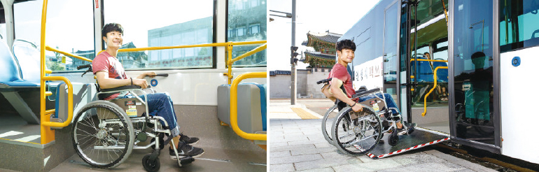 라이온스시티 저상버스는 휠체어를 이용하는 교통약자들에게도 좋은 평가를 받고 있다. 차체와 보도 사이를 연결해주는 ‘자동경사판’과 탑승자 쪽으로 차체가 최대 80mm까지 낮아지는 ‘닐링 시스템(Kneeling System)’이 있어 이용 만족도가 높단다. 출입구만 낮게 설계한 기존 저상버스 모델들과 달리 차체 전체를 완전히 저상 설계해 차별화를 꾀했다.