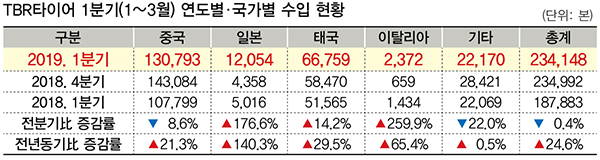 수입산 TBR타이어 공세는 여전히 거셌다. 올 1분기 국내 수입된 TBR타이어는 모두 23만 4,148개로 지난해 같은 기간(18만 7,883개)보다 24.6% 늘었다. 중국산 TBR타이어가 대거 수입된 작년 4분기에 비해선 소폭(0.4%) 줄었지만, 비슷한 수준을 유지했다.