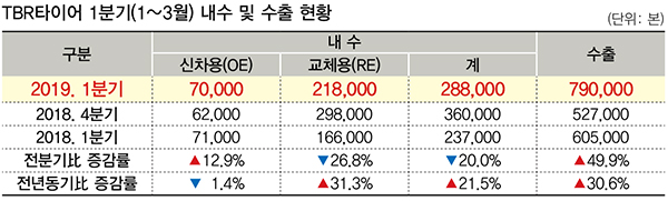 수출 실적부터 살펴보면, 회복세가 뚜렷하다. 올 1분기 해외로 팔려나간 국산 TBR타이어는 모두 79만개(본). 이는 지난해 같은 기간(60만 5,000개) 수출량보다 30.6%가 많은 양이다. 직전 분기인 2018년 4분기(52만 7,000개)와 비교하면 49.9% 증가했다.