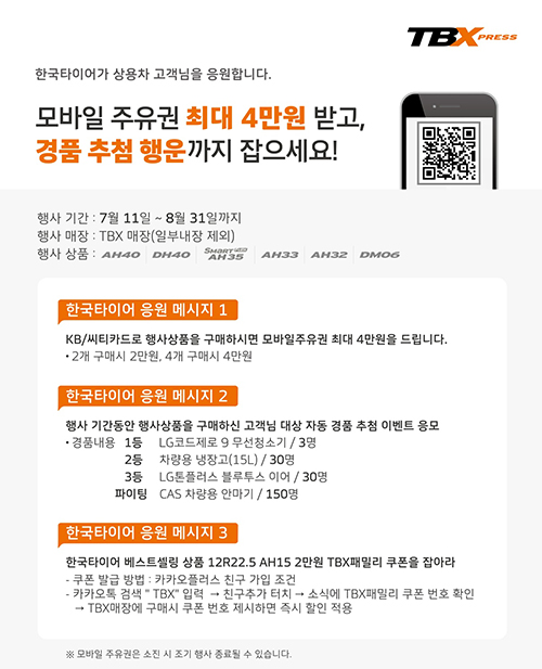 이와 함께 현장에서 즉시 사용이 가능한 TBX 패밀리 쿠폰도 제공한다. 카카오톡에서 TBX를 검색해 카카오플러스 친구로 추가하면 한국타이어의 베스트셀링 상품 ‘AH15’ 2만원 할인 쿠폰을 지급한다.
