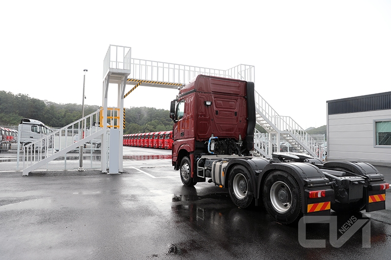 출하대기장도 예사롭지 않다. 쏟아지는 비가 무색할 정도로 고요한 실내 출하대기장은 차량크기에 따라 최소 30대에서 최대 50대까지 수용할 수 있는 크기였다. 그리고 이곳에서 맞닥뜨린 벤츠트럭은 역시나 쾌적한 모습을 자랑했다.