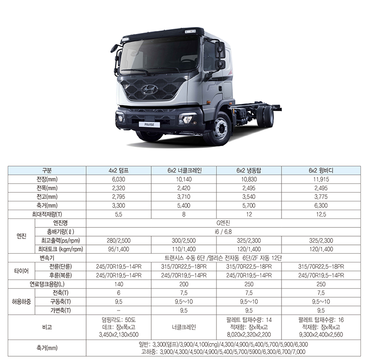 현대자동차가 5톤급 4×2(4개 바퀴 축 중, 동력 축 2개) 중형트럭과 고하중 대응의 6×2 준대형 트럭 시장을 겨냥해 파비스(PAVISE)를 선보였다.