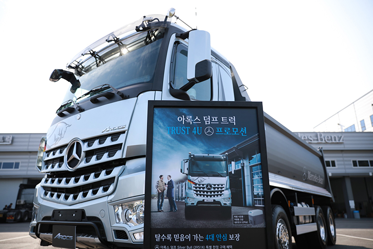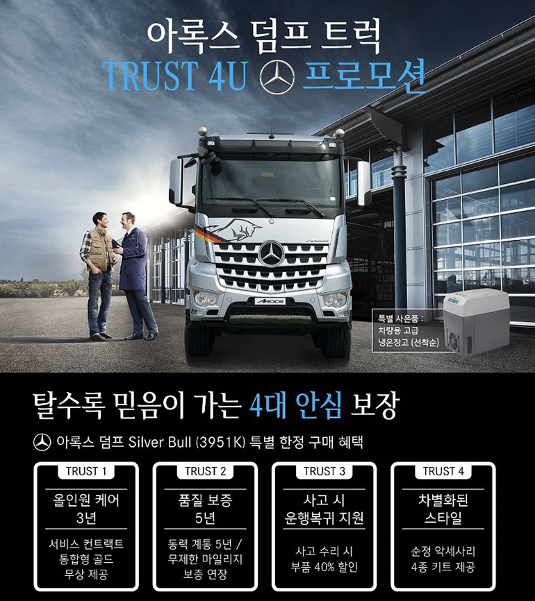 메르세데스-벤츠 아록스 덤프트럭 TRUST 4U 특별 한정 프로모션은 건설 불황기에 수익 확보에 대한 어려움과 큰 수리비 부담으로 고충 받고 있는 덤프트럭 고객들을 위해 차량 유지 관리에서부터 정비, 사고 수리까지 그간 업계에서 시도된 적 없던 포괄적 차량 서비스 혜택을 제공하고자 마련됐다.