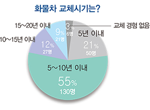 뒤를 이어 5년 이내 21%(50명), 10~15년 이내 12%(27명), 15~20년 이내 9%(21명), 교체경험 없음 3%(6명) 순으로 집계됐다.
