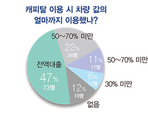 이어 △차량가의 50~70%미만 22%(34명) △캐피탈을 이용하지 않았다는 응답자가 12%(19명) △차량가의 30~50%미만 11%(17명) △차량가의 30%이내 8%(12명) 순으로 조사됐다.