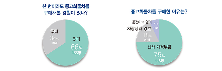 이어 “한 번이라도 중고화물차를 구매해본 경험이 있나”라는 질문에는 과반을 훌쩍 넘는 66%(155명)가 구매경험이 있다고 답했다. 반면 구매경험이 없다는 운전자는 34%(79명)에 달했다.