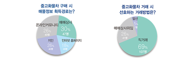 이 밖에 중고화물차 구매 시 선호하는 거래방법은 ‘직거래’가 69%(107명)로 가장 많았으며, ‘매매상사 위임’(26%, 41명), 알선(5%, 7명) 순으로 나타났다.