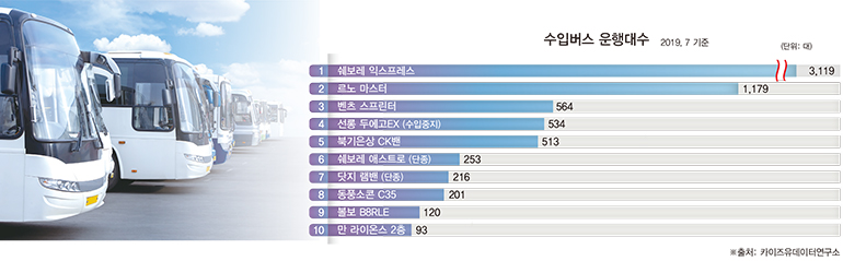 국산 브랜드 중심에서 꿋꿋하게 버텨오고 있는 수입버스 모델은 누굴까. 현재(2019년 7월 말 기준)까지 수입산 승합 및 버스의 운행대수를 순위별로 살펴봤다. 참고로, 이 버스 운행대수 분석은 동급, 비동급 모두 포함한 비교치이다.