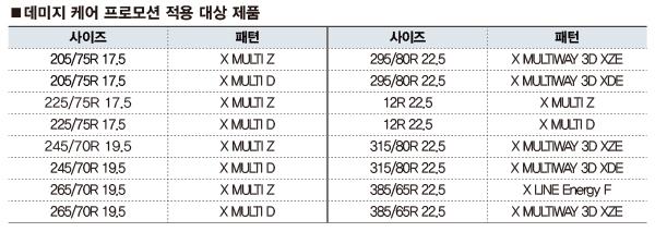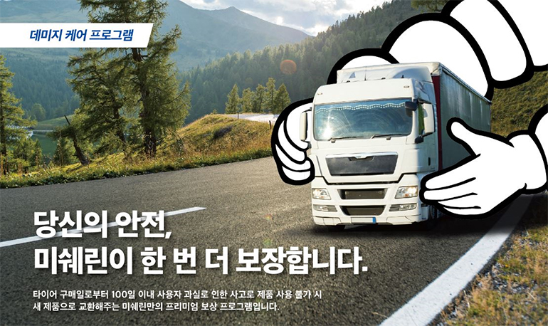 미쉐린코리아는 올 12월 말까지 미쉐린 트럭 타이어를 구매한 고객들을 대상으로 타이어 손상을 일부 보상해주는 ‘데미지 케어 포로모션’을 실시한다고 18일 밝혔다.