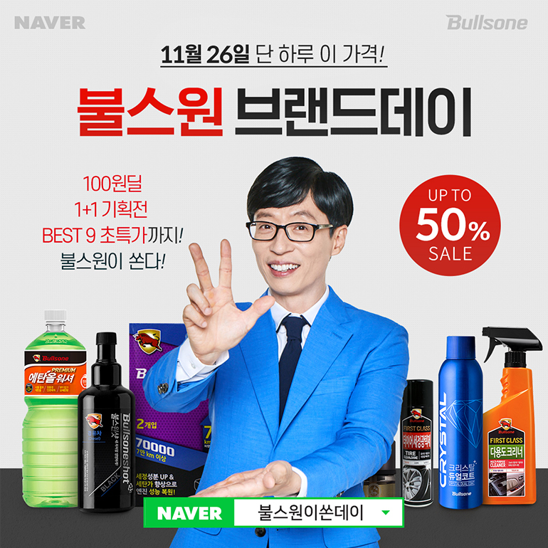 불스원은 네이버쇼핑과의 제휴를 통해 11월 26일 하루 동안 △100원딜 △1+1 기획전 △BEST 9 초특가 판매 등 주요 제품을 특별한 가격에 만날 수 있는 브랜드데이 행사를 진행한다.