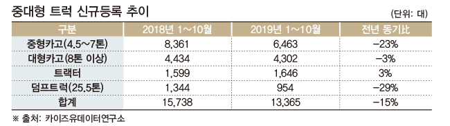 국토교통부의 차량 등록 원부 데이터를 가공, 본지에 독점 공개하고 있는 카이즈유데이터연구소에 따르면, 올 1~10월까지 신규로 등록된 4.5톤 이상 중대형카고, 트랙터, 덤프트럭(25.5톤 이상)은 1만 3,365대로 지난해 동기(1만 5,738대)에 비해 15% 감소했다.