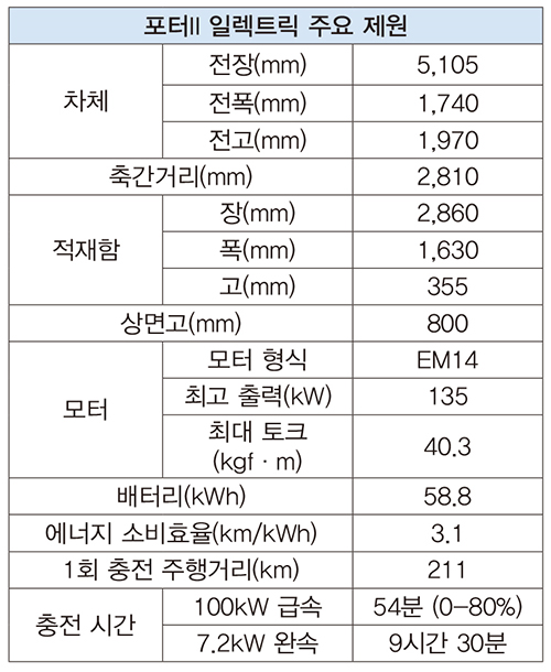 포터II 일렉트릭의 파워트레인을 살펴보면, 135kW 모터와 58.8kWh 배터리를 탑재해 완충 시 211km를 주행할 수 있다. 아울러 적재 중량을 감지해 주행 가능한 거리를 실시간으로 안내하는데 이는 적재 중량에 따라 하중의 변화가 큰 상용 전기차의 특성을 고려한 것이다.