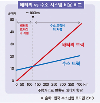 이 보고서는 장거리를 요하는 대형트럭 및 고속버스의 경우 긴 주행거리와 짧은 충전시간이 강점인 수소차가 대안이 될 것으로 전망하고 있다. 반면, 상대적으로 짧은 주행거리를 요하는 중·소형급 차량의 경우 효율 좋은 전기차가 활용될 것으로 보고 있다.