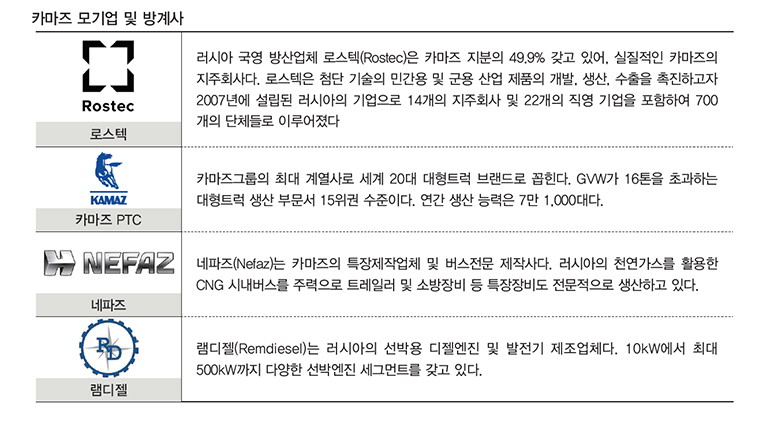 카마즈는 러시아의 최대 상용차 제조사로 베트남, 이란, 인도, 카자흐스탄, 파키스탄 등에 생산시설을 갖춰 연간 7만 여 대의 생산능력을 보유하고 있다. 현재 동유럽을 비롯해 중국, 중동, 북아프리카에 수출되고 있다.