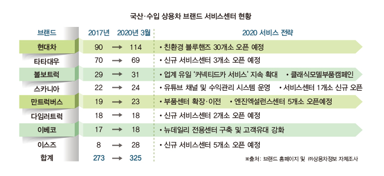 현재(2020년 3월 기준) 기준 국산·수입 상용차 브랜드 8개사가 운영하는 서비스센터는 총 325개소로 조사됐다. 273개소였던 지난 2017년보다 52곳이 늘었다.