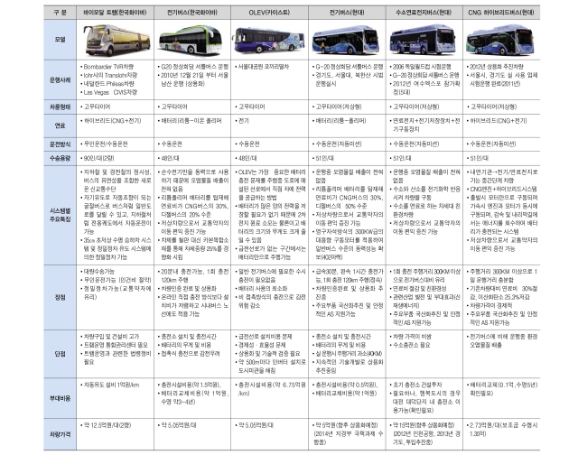 ■ CNG하이브리드 버스(현대자동차) - 경제성 검증된 차세대 버스 이미 상용화로 검증된 CNG하이브리드 버스는 차량가격이 저렴해 보급에 알맞다는 평가다. 전기·수소버스에 비해 완벽한 오염물질 차단이 어렵다는 것이 단점이다.