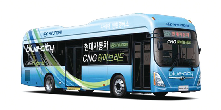 CNG 버스가 더욱 진화했다. 현대차는 기존 CNG 버스 에어로시티 기반에 전기모터를 추가 탑재한 친환경 CNG 하이브리드 버스 ‘블루시티’를 내놓았다.