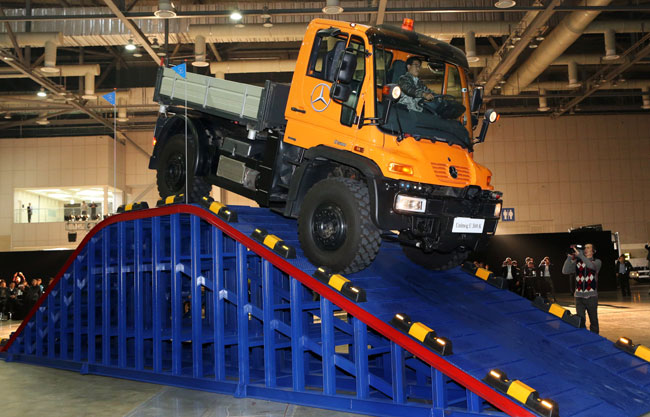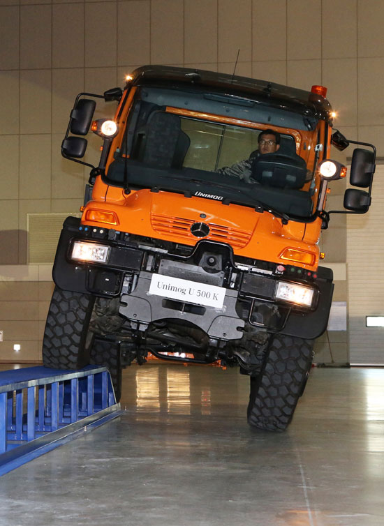 시연은 통나무 구간, 계단 구간 등의 실제 험로를 형상화 한 구간과 유니목의 디퍼렌셜 잠금장치 기능을 확연히 볼 수 있는 4×4 주행 구간, 측면 경사 구간, 급경사 구간 등으로 다양하게 구성됐다.