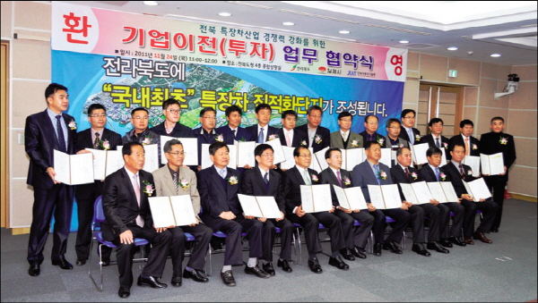 | 2011. 12월 | 전북·김제시·전북자동차연구원 및 21개 업체 ‘특장차 집적화 단지 조성을 위한 기업이전 및 투자를 위한 업무협약' 체결 |