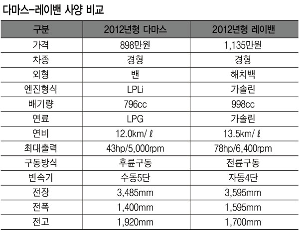 그렇다면, 내년부터 단종이 현실화될 경우 대체 모델이나 대안은 없는가? 트럭형인 라보의 경우 현재로서는 대체모델을 찾기가 사실상 어려운 실정이다. 몇년 전 국내의 한 업체가 중국의 둥펑(東風)자동차가 생산하는 경트럭 모델을 LPG 차량으로 개조해 도입하려고 했지만 이루어지지 못한 적이 있다. 이러한 시도가 다시 시도된다면모를까 현재는 대체모델이나 대안은 전무한 실정이다. 하지만 승합형인 다마스의 경우는 단종이 될 경우 기존 국내 출시된 차량 중에서는 기아자동차의 ‘레이밴’이 새로운 대안으로 떠오르고 있다. ‘레이밴’은 지난 2012년 6월 소형밴으로 출시됐다. 최고 출력 78마력(ps), 최대 토크 9.6 kg·m의 카파 1.0 가솔린엔진을 탑재, 17.0km/ℓ(신연비 복합모드 13.5 km/ℓ)의 연비 등을 갖추고 있다. 다마스보다는 다소 높은 사양이지만, 경상용차로 활용되기에는 손색이 없다. ‘레이밴’은 다마스처럼 차량 구입 시 취득세 및 채권구입면제, 고속도로 통행료·혼잡통행료·공영주차료 각 50% 감면 등 다양한 경차 혜택을 받을 수 있다. 게다가 다마스에서 문제가 되었던 안전문제도 에어백, ABS, VCD등이 기본 탑재되어 있어 안전성에 대한 우려도 낮다. 다만, 가격이 높다는 점과 휘발유 차량이라는 점 등이 감점요인이 될 수 있겠지만 다마스가 단종되는 현실에서 국내 출시된 차량 중에서는 유일한대안으로 꼽히고있다. 국내차량이 없다면, 해외는? 해외에서도 소형 상용차는 다마스와 비슷한 사양의 차량은 거의 판매되지 않고 있다. 인도나 중국의 경우를제외하고는 어느 정도의 대형화가 이루진 것이다. 현재 판매 중인 해외의 경형 승합차 중에서는 중국 둥펑자동차의 경상용차 정도가 그나마 비슷한 사양이라고 할 수 있다. 하지만 지난 2011년, 둥펑자동차는 한국진출을 시도했으나 국내규제와 기준에 못미쳐 수입이 좌절된 바 있다. 하지만 가격이나 성능만을 본다면 국내에 경형 상용차 진출이 이루어진다는 가정 하에 그나마 경쟁해 볼 만할 것으로 보인다.