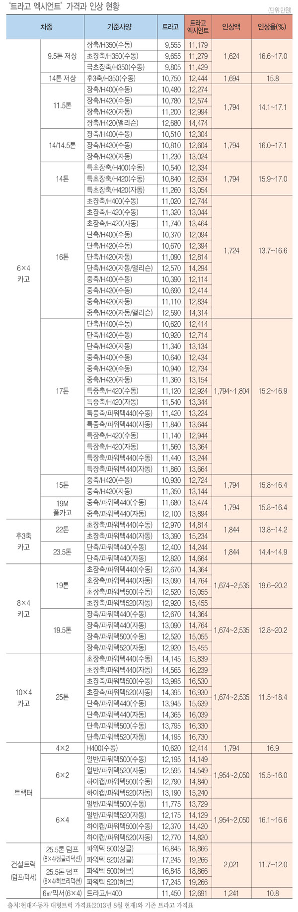 신형 ‘트라고 엑시언트’에 대한 현대차의 이같은 가격 인상폭은 최대 1,800~2,000만원 정도가 될 것이라는 당초 예상치(상용차매거진 2013.2월호 참고)보다 높은 것으로, 현대차가 트럭부문에서 이제껏 취한 가격 인상조치로는 사상 최대의 금액이다.