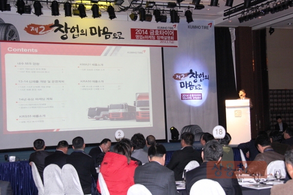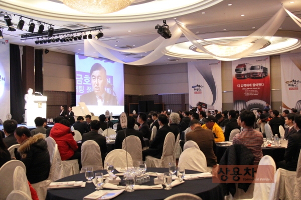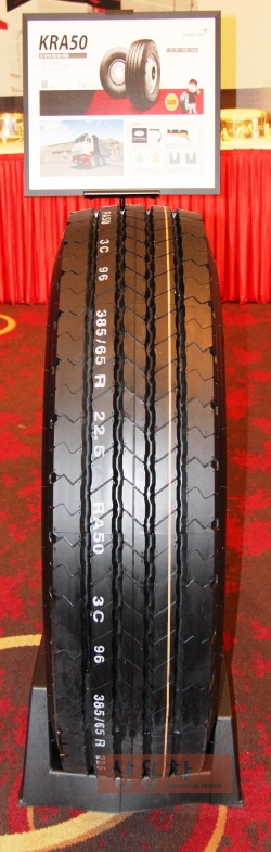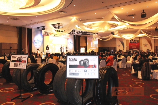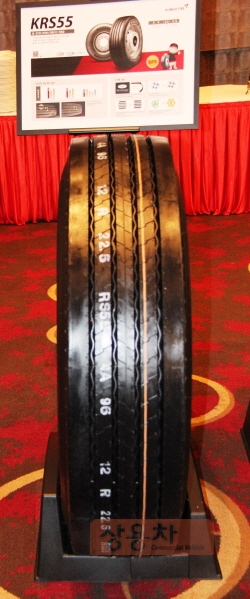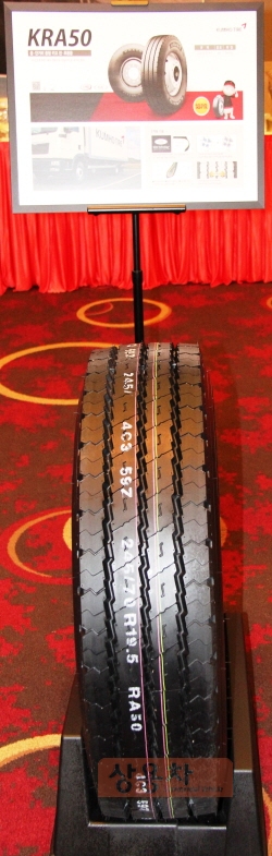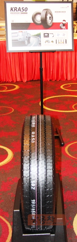 금호타이어는 지난 7일(금) 대전 유성 리베라호텔에서 대리점주 및 금호타이어 관계자 300여명을 초청해 대형덤프 및 중형카고용 제품인 KRA50 (대형덤프용 385/65R22.5, 중형카고용 245/70R19.5)을 비롯, 대형카고 전륜용 프리미엄 신제품 KRS55 (12R22.5) 및 15톤 덤프용 KMA21 (12R22.5) 등 총 5개 제품을 공개했다.