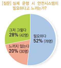화물차 운전자들 중 과반수가 안전시스템의 필요성을 실감하는 것으로 나타났다. <실제 운행 시 안전시스템이 필요하다고 느끼는가>라는 질문에 대해 전체 응답자 150명 중 52%(78명)가 ‘필요하다’고 답했다. ‘그저 그렇다’고 답한 응답자는 28%(42명)였으며 ‘필요하다고 느끼지 않는다’는 20%(30명)에 그쳤다.