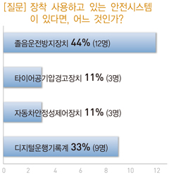 운전자들이 사용하고 있는 안전시스템의 종류 역시 한정적이었다. 지난 2010년 ‘교통안전법 시행령’에 따라 장착이 의무화된 디지털운행기록계가 33%(9명), 대형사고와 직결되는 졸음운전방지장치가 44%(12명)로 그나마 찾아볼 수 있는 정도였다. 타이어공기압경보장치와 자동차안정성제어장치가 각각 11%(3명)였으며, 최고속도제한장치나 차로이탈경고장치 등은 장착된 차량을 발견하지 못했다.
