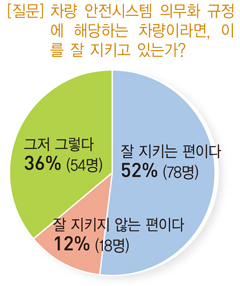 현재 차량 안전시스템은 정부 차원에서 일부 의무화를 추진했거나, 의무화 예정에 있다. 이에 <차량 안전시스템 의무화규정에 해당하는 차량이라면, 이를 잘 지키고 있는가>라는 질문에 응답자 52%(78명)가 ‘잘 지키는 편’이라고 답했으며, ‘잘 지키지 않는 편’이라 답한 응답자가 12%(18명), ‘그저 그렇다’는 36%(54명)였다. 의무란 단어 그대로 꼭 지켜야 하는 것을 뜻한다. 그럼에도 불구하고 거의 절반에 달하는 운전자들이 안전시스템 의무화규정에 따르는 여부에 대해 확답을 하지 않았다.
