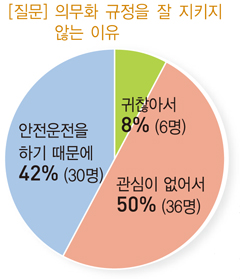 안전시스템 의무화규정을 잘 지키지 않는 편이거나, 그저 그렇다고 답한 운전자 72명에게 <의무화규정을 지키지 않는 이유>에 대해 묻자 42%(30명)가 ‘자체적으로 안전운전을 하기 때문’, 8%(6명)가 ‘귀찮아서’라고 답했다. 특히 50%(36명)가 ‘의무화규정에 관심이 없어서 몰랐다’고 답해 운전자들에게 안전시스템 의무화규정에 대한 명확한 정보가 전달되지 않았음을 알 수 있었다.