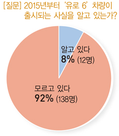 정보의 단절은 위에서 언급한 안전시스템 의무화규정뿐만 아니라 새로 적용되는 배기가스 배출 기준인 ‘유로 6’도 마찬가지인 것으로 나타났다. <2015년 부터 ‘유로 6’ 차량이 나온다는 사실을 알고 있는가>란 질문에 응답자 대부분인 92%(138명)가 ‘모른다’고 답했다. 사실 배기가스 배출 기준이나 안전시스템 의무화규정 등은 정부의 강제 조항으로 시행 시점이 다가오기 전까지는 운전자 대부분이 큰 관심을 두지 않는게 현실이다. 그렇기 때문에 굳이 찾아봐야 알 수 있는 정보인 셈이다.