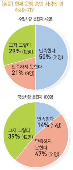 흥미롭게도 국산차량과 수입차량에 대한 차량만족도가 꽤 큰 차이를 보였다. 국산차량과 수입차량의 운전자들에게 각각 차량만족도를 물은 결과, 국산차량 운전자 108명 중 14%(15명)만이 ‘만족한다’고 답한 반면 수입차량 운전자는 42명 중 50%(21명)가 만족감을 표현했다. 국산차량의 경우 ‘만족하지 못한다’가 절반에 가까운 47%(51명)에 달해 국산차량 운전자들이 수입차량 운전자들에 비해 만족도가 낮은 것으로 드러났다.