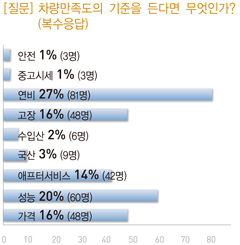 이밖에도 ‘애프터서비스(A/S)’가 14%(42명), ‘국산’이 3%(9명), ‘수입산’이 2%(6명), ‘안전’과 ‘중고시세’가 각각 1%(3명)로, 차량만족도에 영향을 주는 것으로 나타났다.