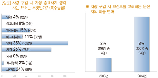 지난 2013년 동일한 질문으로 설문조사를 시행했을 당시 ‘외관’과 ‘중고시세’, ‘브랜드’는 1~2%를 기록해 차량 구입 시 큰 비중을 차지하지 않는 것으로 나타난 바 있었다. 그러나 이번 설문조사에서는 ‘외관’과 ‘중고시세’가 단 한 표도 얻지 못한 반면 ‘브랜드’는 24명의 선택으로 8%를 차지했다. 이는 차량을 구입할 때 선호하는 브랜드의 제품을 우선적으로 살펴보는 운전자들이 늘어난 것으로 풀이된다.
