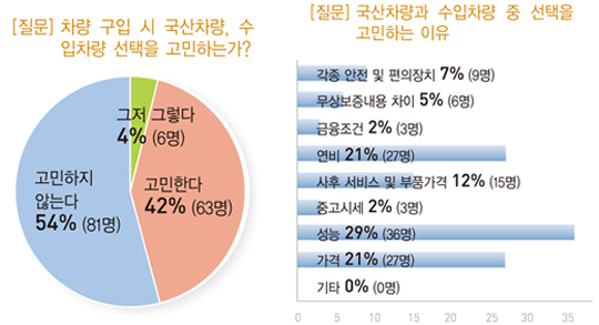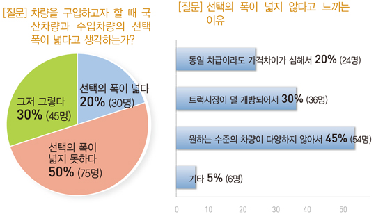그러나 <차량을 구입하고자 할 때 국산차량과 수입차량의 선택 폭이 넓다고 생각하는가>라는 질문에 응답자 중 50%(75명)가 ‘선택의 폭이 넓지 못하다’, 30%(45)가 ‘그저 그렇다’고 답해, 정작 국산차량과 수입차량을 두고 고민할 수 있는 선택권이 그리 많지 않은 것으로 드러났다.