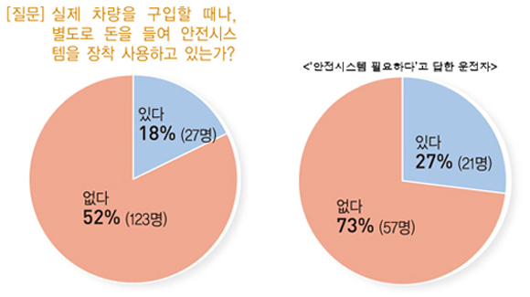 그러나 <실제 차량을 구입할 때나, 별도로 돈을 들여 안전시스템을 장착 사용하고 있는가>에 대한 질문에는 ‘사용한다’라고 답한 응답자가 18%(27명)밖에 되지 않아, 실제 안전시스템을 장착해 사용하고 있는 운전자는 많지 않은 것으로 드러났다. 심지어 안전시스템이 필요하다고 답했던 응답자들 중에서도 단 27%(21명)만이 안전시스템을 장착하고 있었다.