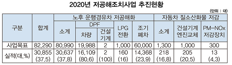 구체적으로 서울시는 조기폐차 14,368대, 매연 저감장치 부착 16,109대, 1톤 화물차 LPG차 전환 160대, PM-NOx부착 및 건설기계 엔진교체 218대를 진행했다.