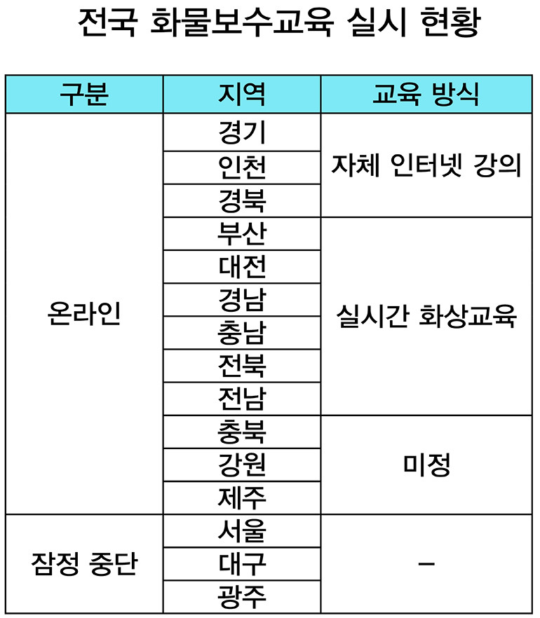 한편 대부분의 지역이 11월~12월까지 온라인 교육을 계획한 가운데 전라북도와 전라남도는 추후 코로나19 대책에 따라 오프라인 교육을 재개한다는 계획이다. 특히 전라북도는 현재 10월 교육에 한해 오프라인 교육 신청을 받고 있다.