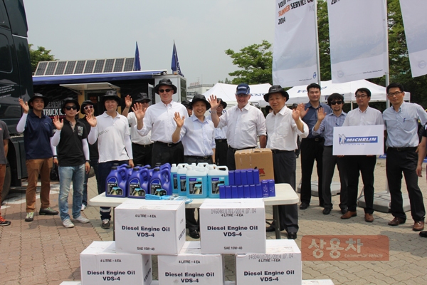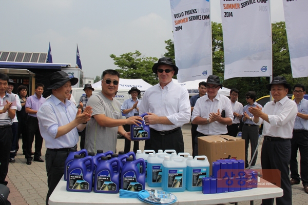모빌코리아윤활유(주) 러셀 캔필드 사장이 ‘2014 볼보트럭 여름 서비스 캠프’를 방문한 한 고객에게 자사 상품인 엔진오일을 무료 증정하고 있다.