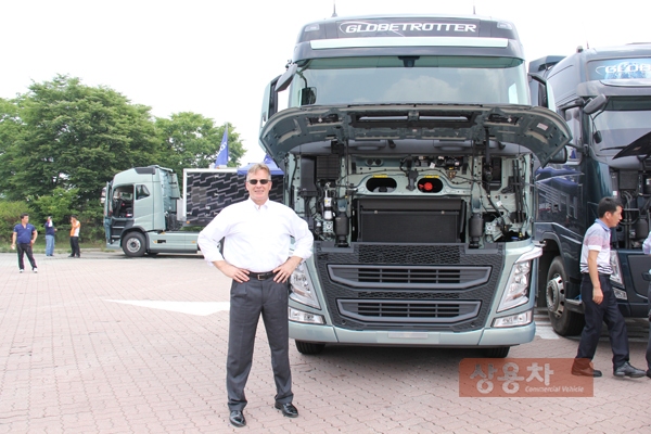 모빌코리아윤활유(주) 러셀 캔필드 사장이 볼보트럭 앞에서 포즈를 취하고 있다.