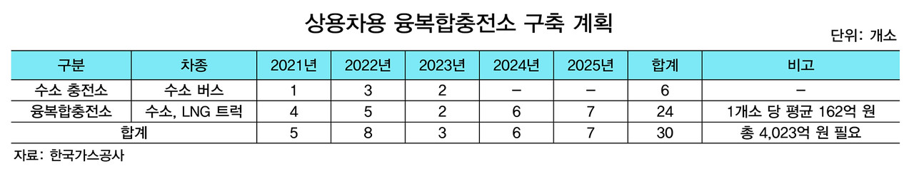 한국가스공사는 지난달 약 4천억 원을 투자해 오는 2025년까지 LNG‧수소 융복합 충전소를 24개소 건설한다고 밝혔다. 당장 내년부터 385억 원을 들여 4개소를 구축할 계획이다.
