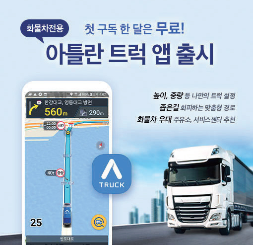 한편 최근 출시한 아틀란 트럭 앱은 국내 유일의 대형차를 위한 내비게이션으로 화물차 특성을 고려한 맞춤형 경로와 다양한 편의 기능을 탑재했다.