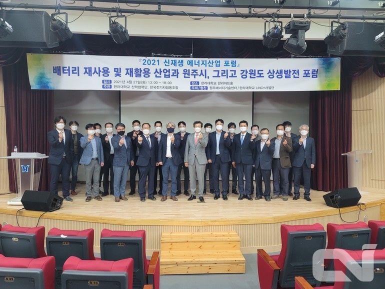 한국전기차협동조합이 지난 27일 강원지역 배터리 재사용 기술 및 산업 조성 방안을 논의하기 위해 ‘2021 신재생에너지 산업 포럼’을 열었다. 이번 포럼은 한국전기차협동조합과 한라대학교 산학협력단이 주관했으며 강원도 원주 소재 한라대학교에서 진행됐다.
