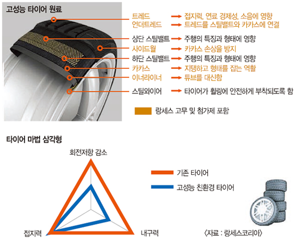 특히, 회전 저항이 낮아 연비를 상승시켜 유지비를 절감시키고, 내구성은 물론 접지력에서도 탁월한 성능을 보인다는 ‘고성능 친환경 타이어’는 평균적으로 타이어 회전저항이 10% 감소하면 자동차 연비는 약 1.5% 개선돼, 기존 일반 타이어보다 비싸다는 단점이 있음에도 궁극적으로는 연료소비를 5~7% 절감하는 효과를 가져와 단점을 상쇄한다.