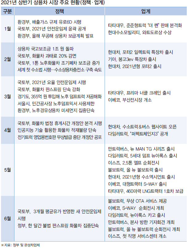 길고 어두웠던 ‘코로나 터널’의 끝이 다가온 것일까. 지난해 코로나19 여파로 최악의 한 해를 보냈던 국내 상용차시장은 올해 상반기(1~6월)에 굵직한 정책과 신차 소식을 잇달아 전하며 재도약을 위한 준비를 마친 모습이다.